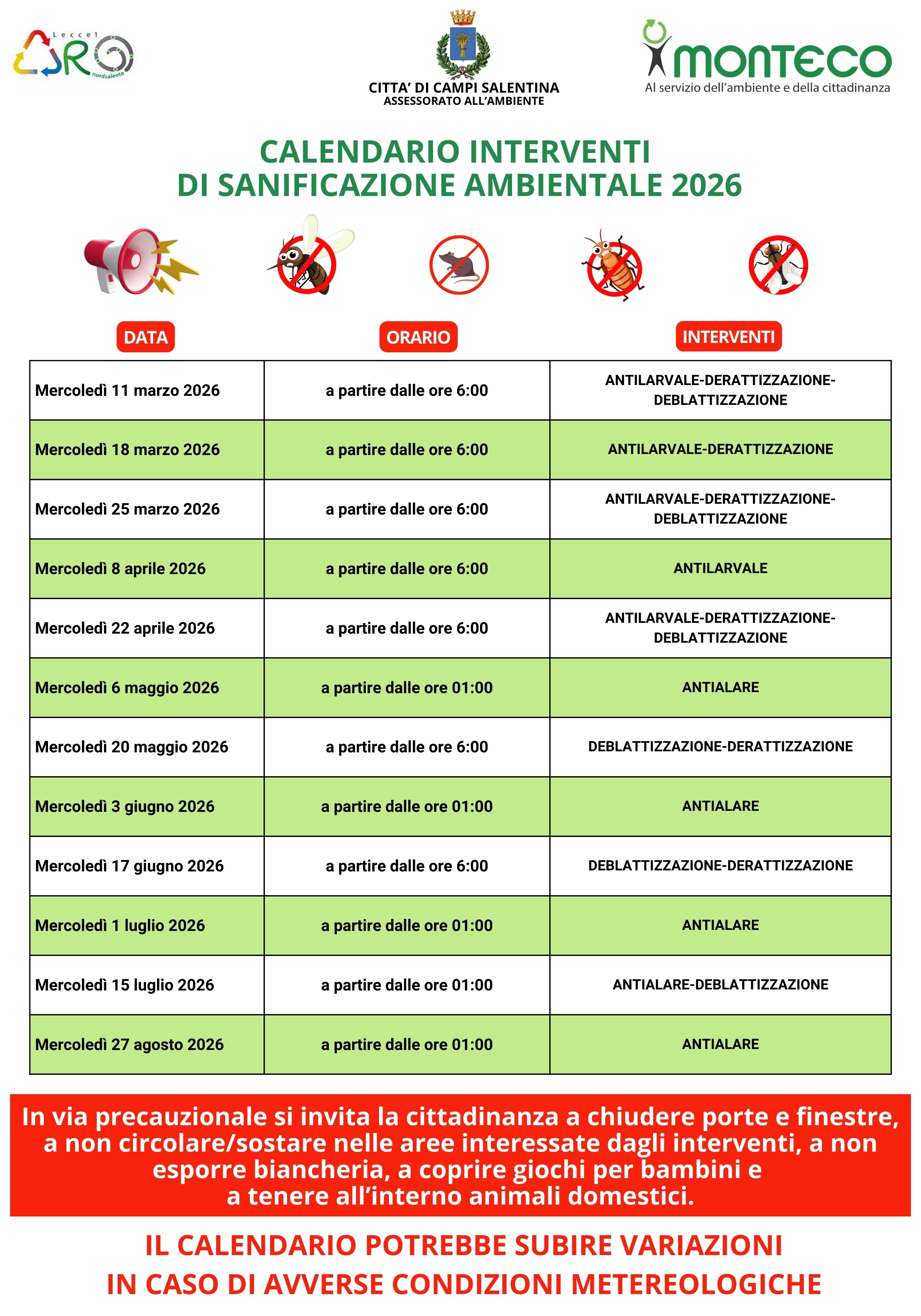 Per le date indicate nel calendario di INTERVENTI DI SANIFICAZIONE AMBIENTALE 2026, si invita tutta la cittadinanza del  Comune di Campi Salentina 𝗮 𝗰𝗵𝗶𝘂𝗱𝗲𝗿𝗲 𝗽𝗼𝗿𝘁𝗲 𝗲 𝗳𝗶𝗻𝗲𝘀𝘁𝗿𝗲, 𝗮 𝗻𝗼𝗻 𝗰𝗶𝗿𝗰𝗼𝗹𝗮𝗿𝗲/𝘀𝗼𝘀𝘁𝗮𝗿𝗲 𝗻𝗲𝗹𝗹𝗲 𝗮𝗿𝗲𝗲 𝗶𝗻𝘁𝗲𝗿𝗲𝘀𝘀𝗮𝘁𝗲 𝗱𝗮𝗴𝗹𝗶 𝗶𝗻𝘁𝗲𝗿𝘃𝗲𝗻𝘁𝗶, 𝗮 𝗻𝗼𝗻 𝗲𝘀𝗽𝗼𝗿𝗿𝗲 𝗯𝗶𝗮𝗻𝗰𝗵𝗲𝗿𝗶𝗮, 𝗮 𝗰𝗼𝗽𝗿𝗶𝗿𝗲 𝗴𝗶𝗼𝗰𝗵𝗶 𝗽𝗲𝗿 𝗯𝗮𝗺𝗯𝗶𝗻𝗶 𝗲 𝗮 𝘁𝗲𝗻𝗲𝗿𝗲 𝗮𝗹𝗹'𝗶𝗻𝘁𝗲𝗿𝗻𝗼 𝗮𝗻𝗶𝗺𝗮𝗹𝗶 𝗱𝗼𝗺𝗲𝘀𝘁𝗶𝗰𝗶.